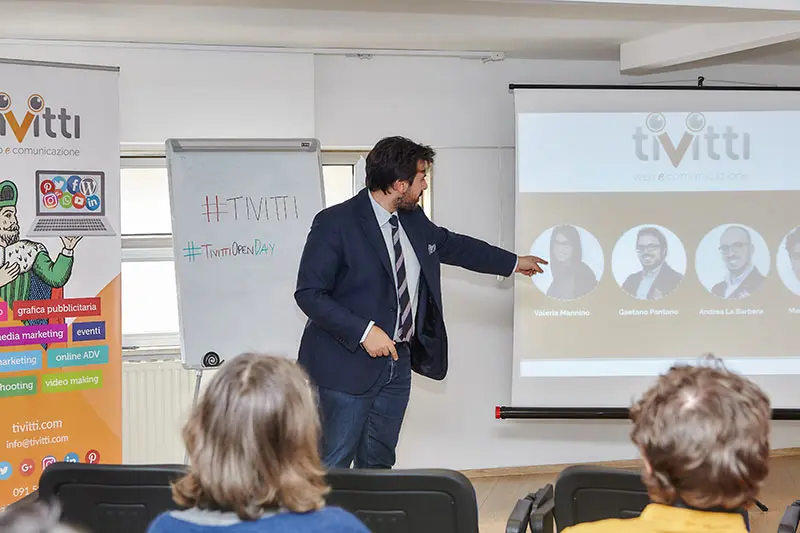 Un percorso itinerante iniziato con la presentazione di Tivitti, startup creata tre anni fa e specializzata in web marketing e advertising, e la spiegazione delle varie fasi della creazione di un progetto di comunicazione integrata. I giovani hanno poi visitato le varie stanze e osservato come si lavora concretamente all’interno di una agenzia di comunicazione: il ricevimento del cliente e la pianificazione di un progetto, il brainstorming interno, il lavoro dei grafici, lo sviluppo di un sito web, l’attività di social media e content marketing e la simulazione uno shooting fotografico. Ad accogliere e guidare i ragazzi sono stati i quattro fondatori di Tivitti – Mauro La Mantia, Valeria Mannino, Andrea La Barbera e Gaetano Pantano – insieme agli altri professionisti che lavorano in agenzia.